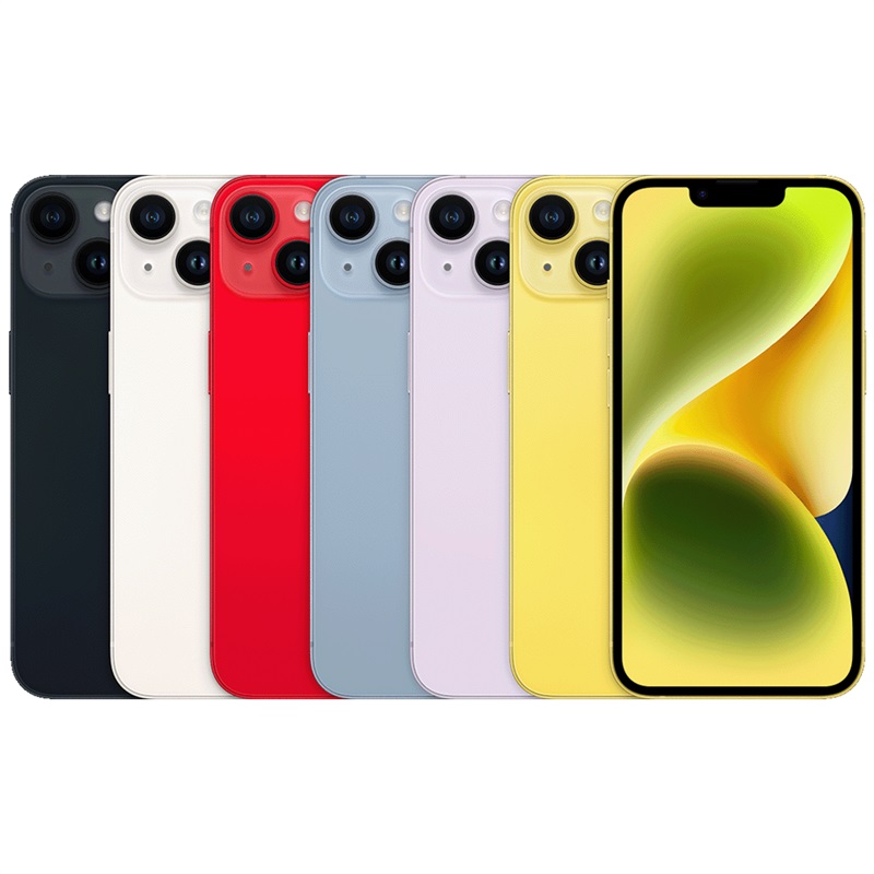 Pohled zepředu a zezadu na iPhone 14 v šesti barvách – temně inkoustové, hvězdně bílé, PRODUCT(RED), modré, fialové a žluté.
